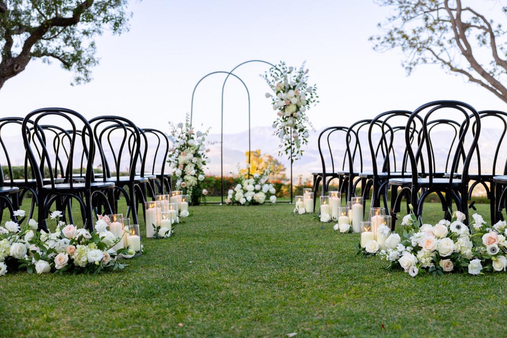 Events By Fran designed this shoot to show couples how romantic a monochromatic color palette can be. There couldn’t have been a more perfect setting for this shoot than Spanish Hills Country Club which is already decked out in black and white. These lush floral arrangements by Tangled Lotus are perfectly classic and add an air of whimsy to the overall design. Kelsey Rinaldi Photography captured every last detail from the lovely modern signage and stationery by The 84th Hour to the ceremony set up so that couples can envision what every element would look like if they decide to go this route with their big day. Keep reading to hear more from Frances Steiner of Events By Fran about why this wedding design is so successful and make sure to check out the full galleryfor even more inspiration!