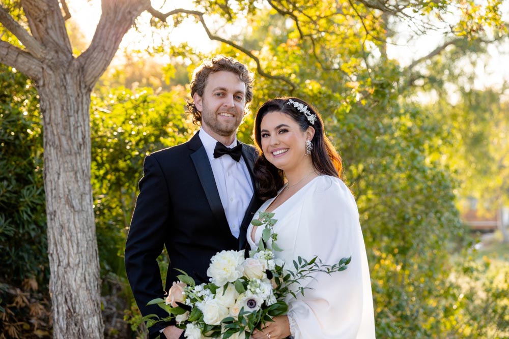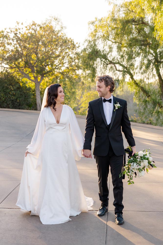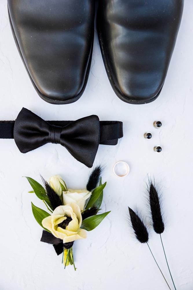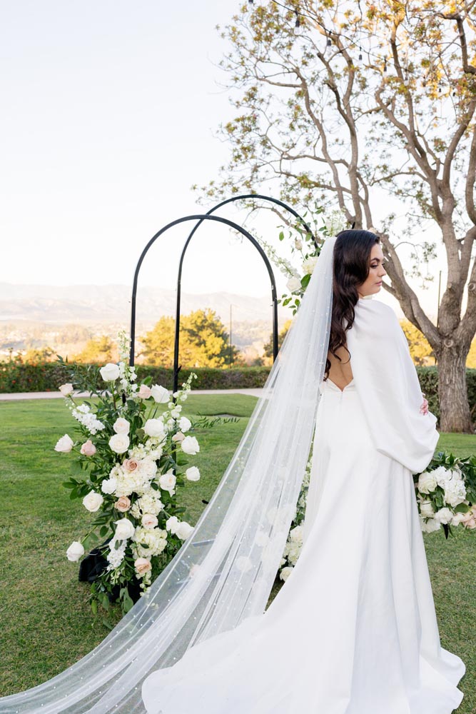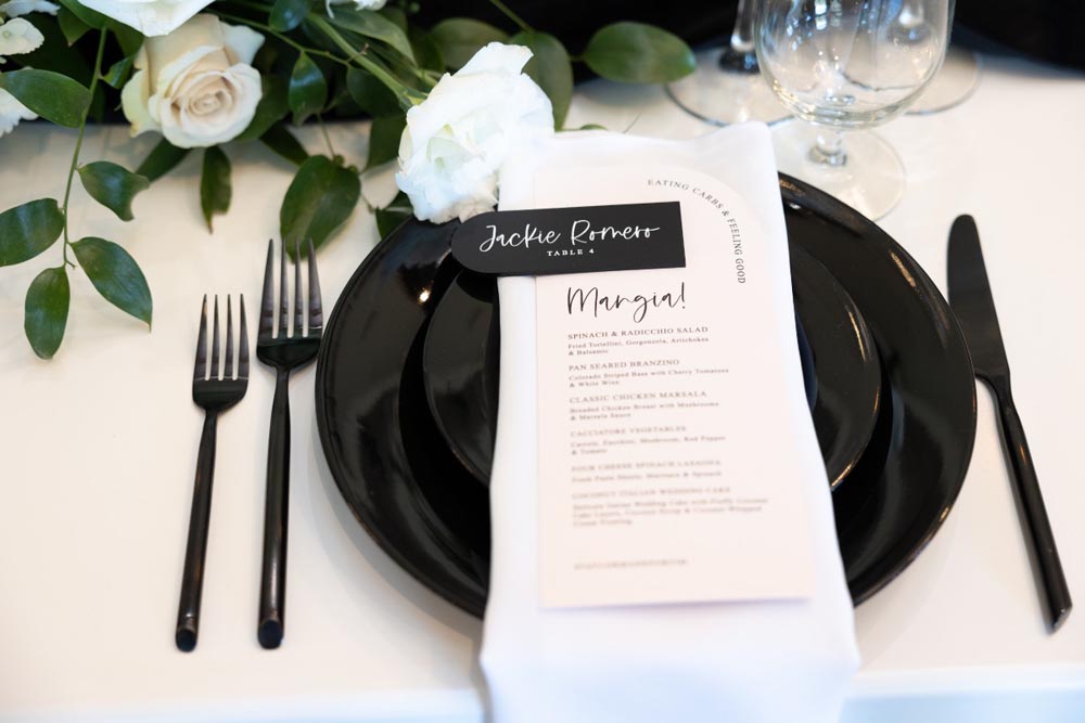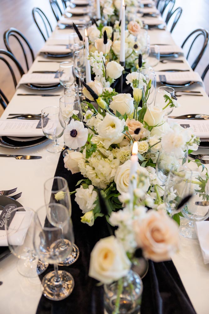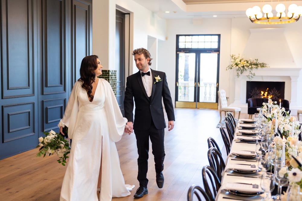 For couples dreaming of something classic, yet ultra-cool for their special day–look no further. This styled shoot, organized by Events By Fran, is a voguish and romantic take on the traditional black & white color palette. The backdrop for this glorious affair was the Spanish Hills Country Club in Camarillo, California. The ceremony site offered a panoramic mountain view, which created a modern fairytale mood when paired with a simple rounded arch, matte black seating, and abundant florals and candles. Inside, the space was a contemporary Gatsby’s dream with geometric architecture and vintage-inspired fixtures, with natural light pouring in from all directions. Mirroring the lush feeling of the ceremony, the reception tablescape featured black flatware and dishes, classy crystal, and blossoming roses, hydrangeas, and poppy anemones, expertly arranged by Tangled Lotus.