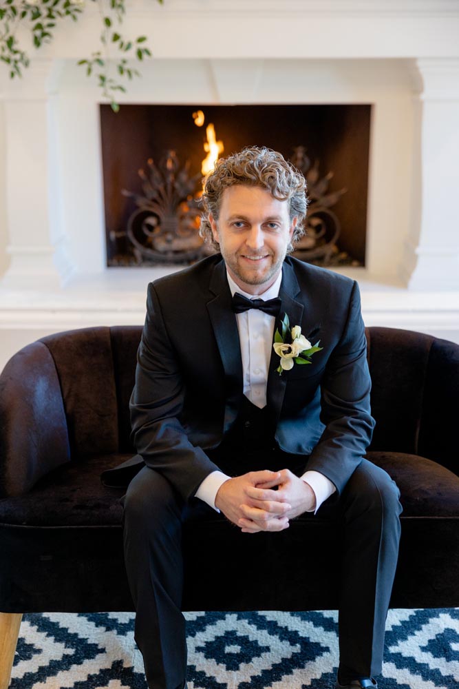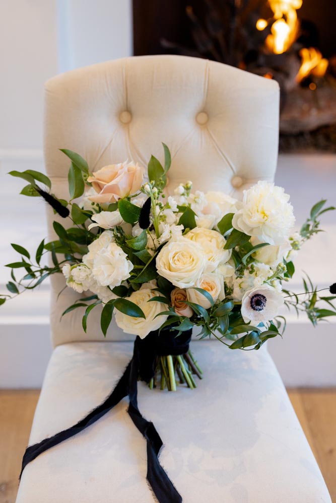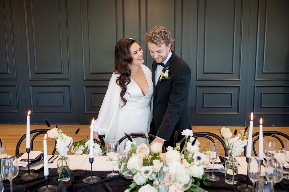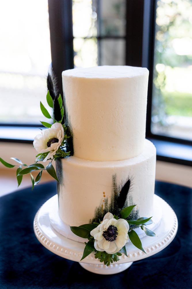 Our styled bride wore a silky wedding gown with long puff sleeves and a ruched, off-the-shoulder reception gown, both from Ever After Bridal, and a floral-inspired headpiece to add a little bit of sparkle. The groom donned a timeless Friar Tux black wedding tux and bowtie. In a toast to love and the stunning atmosphere, the couple enjoyed a glass of champagne and cut a sleek black accented cake, designed by D’Lectable D’Lights, in front of a roaring fireplace.