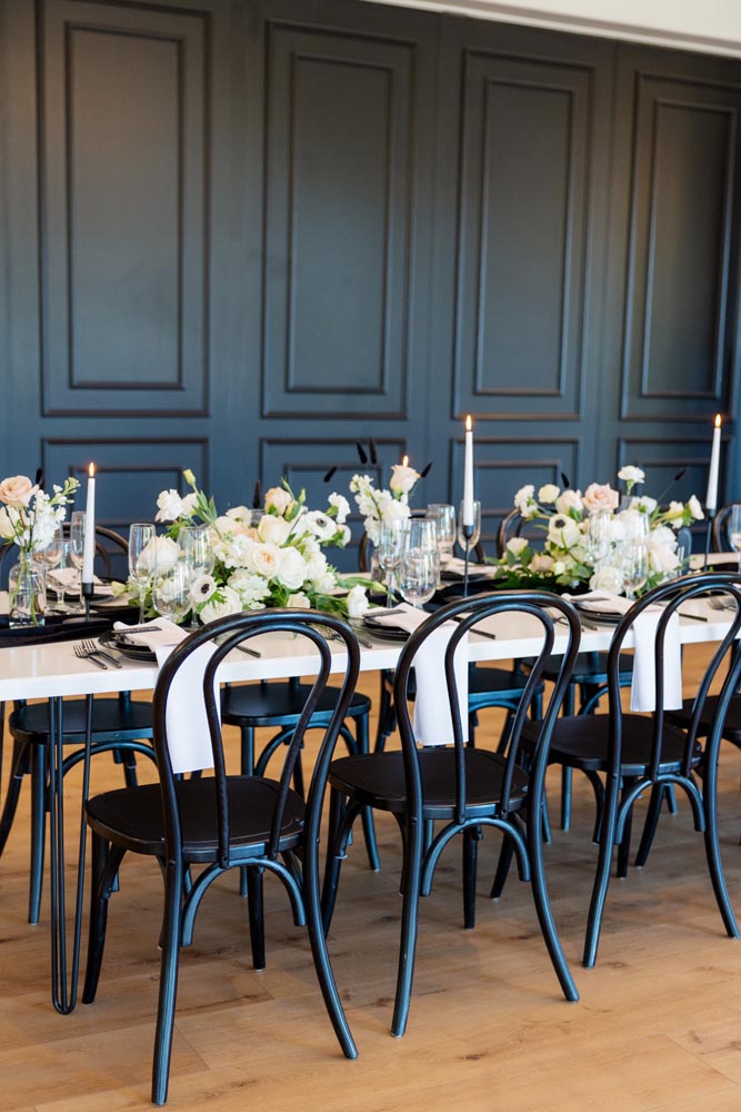 Choosing a wedding design can be challenging, especially if you’re not one of those couples that gravitate towards colorful, romantic color palettes. Thankfully the modern minimalist trend is still going strong and wedding pros are finding new ways to incorporate the trend into their own aesthetic. We love this take on a monochromatic color palette because it’s still soft and playful and leans into natural elements instead of the more common industrial chic look. From the matte black farm chairs and the free-spirited florals to the balloon wall installation, this styled shoot will help you visualize your own timeless wedding from start to finish.