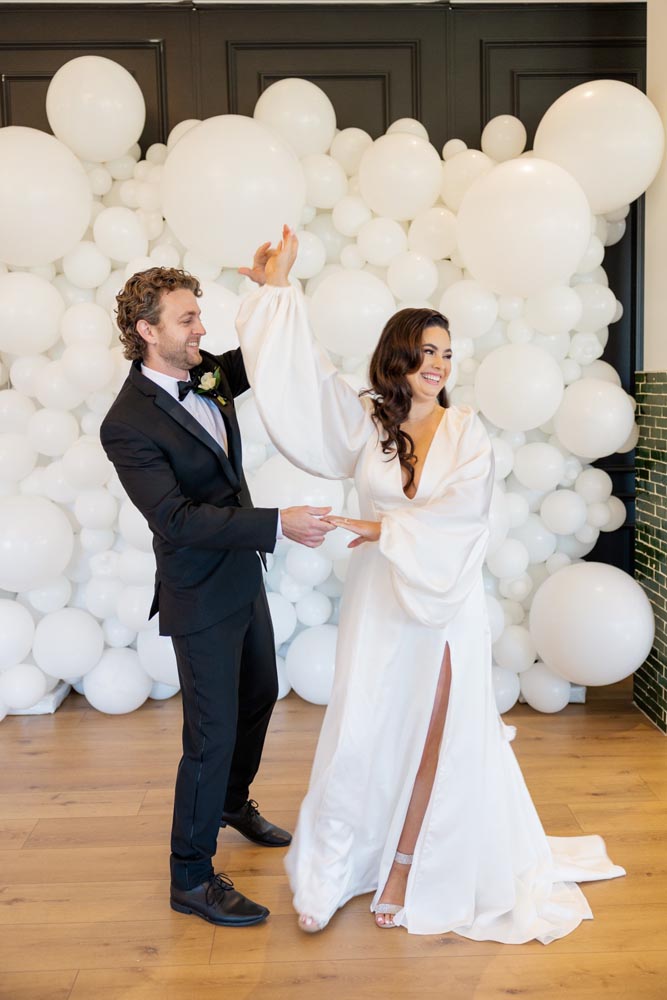 The simple elegance of the day was topped off with a fabulously fun all-white balloon photo backdrop–sure to keep guests entertained all night and provide photos that will keep the couple smiling for decades to come. The many details of this modern glam shoot were beautifully captured by Kelsey Rinaldi Photography and made possible with contributions from many talented vendors.