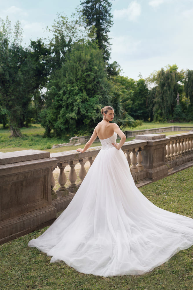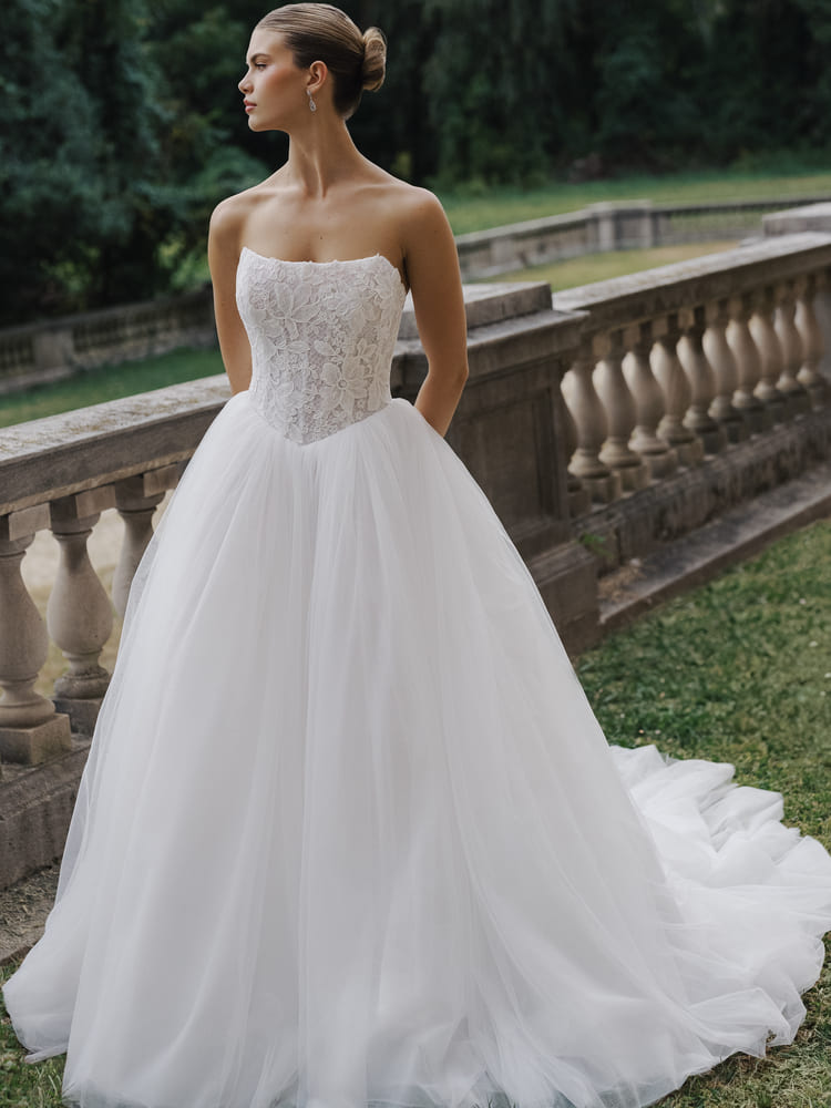 Pointed strapless bodice of Alencon lace with micro-pleated tulle skirt, featuring a basque waist and dramatic extended train in Silk White.