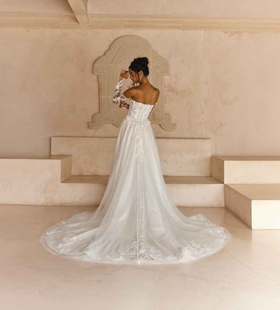 Adding to her royal quality is Lenora’s on-trend Basque waistline, which elongates the body adorned with delicate vine and floral 3D motifs. These are placed with purpose along the bodice for a balance look and added romance.