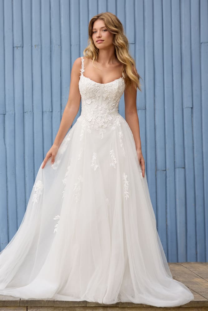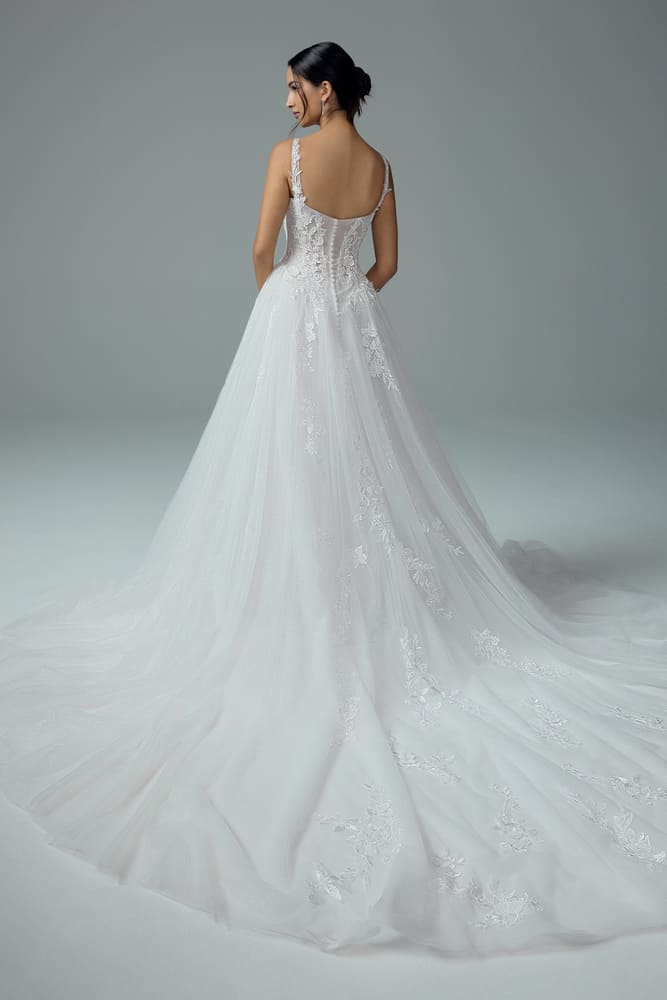 Looking for a unique wedding gown that does not compromise style for comfort? Our Camden A-line bridal gown could be your perfect match! Luxuriously crafted from tulle and floral lace, she promises to glisten with every subtle movement. Her subtle details grant her an epic modern flair. Her gorgeous lace straps perfectly compliment the scoop neckline, creating a romantic look. The gorgeousness does not stop there: Camden’s tulle skirt features panels and pleats to enhance the A-line silhouette. Soft floral lace trickles down from Camden’s bodice onto her skirt, leading the eye down to her dreamy train. Say yes to our romantic and unique wedding gown, Camden!