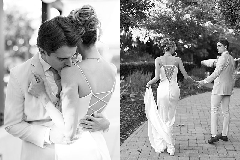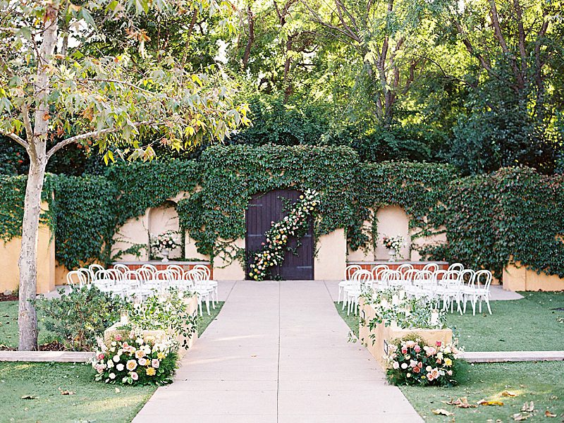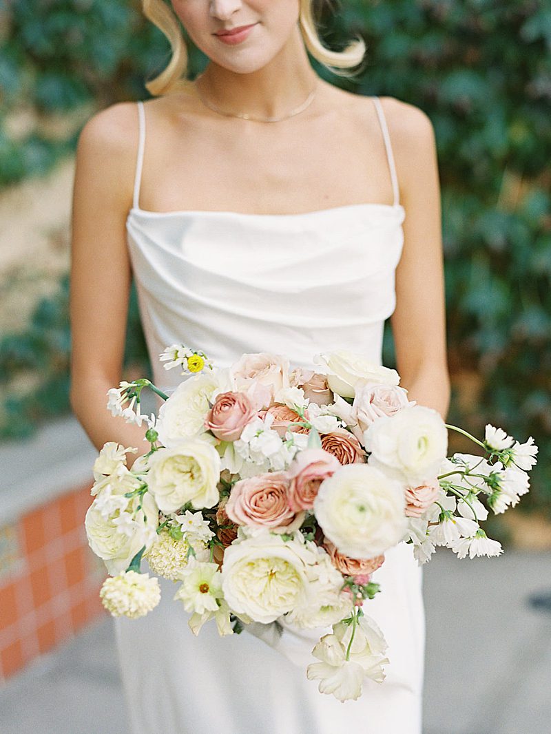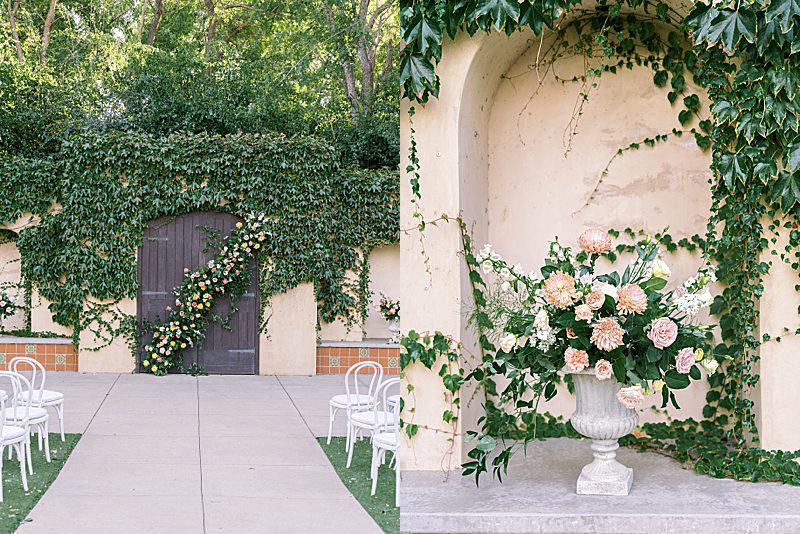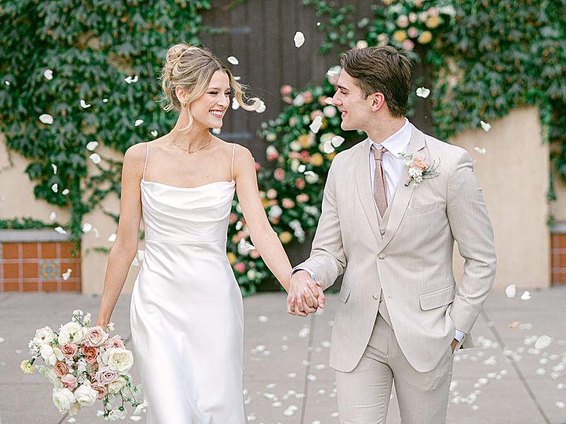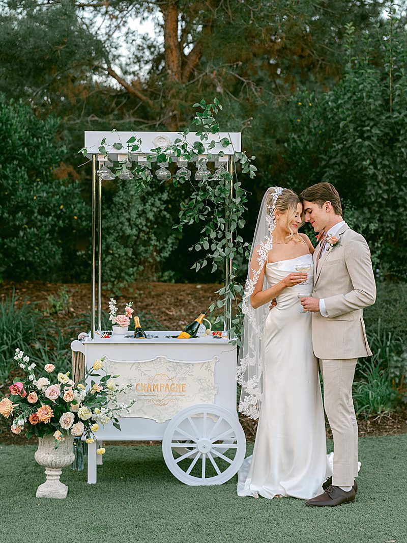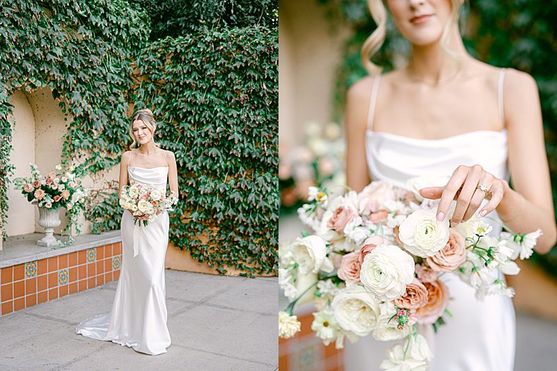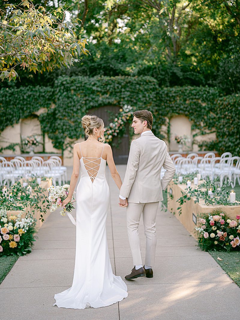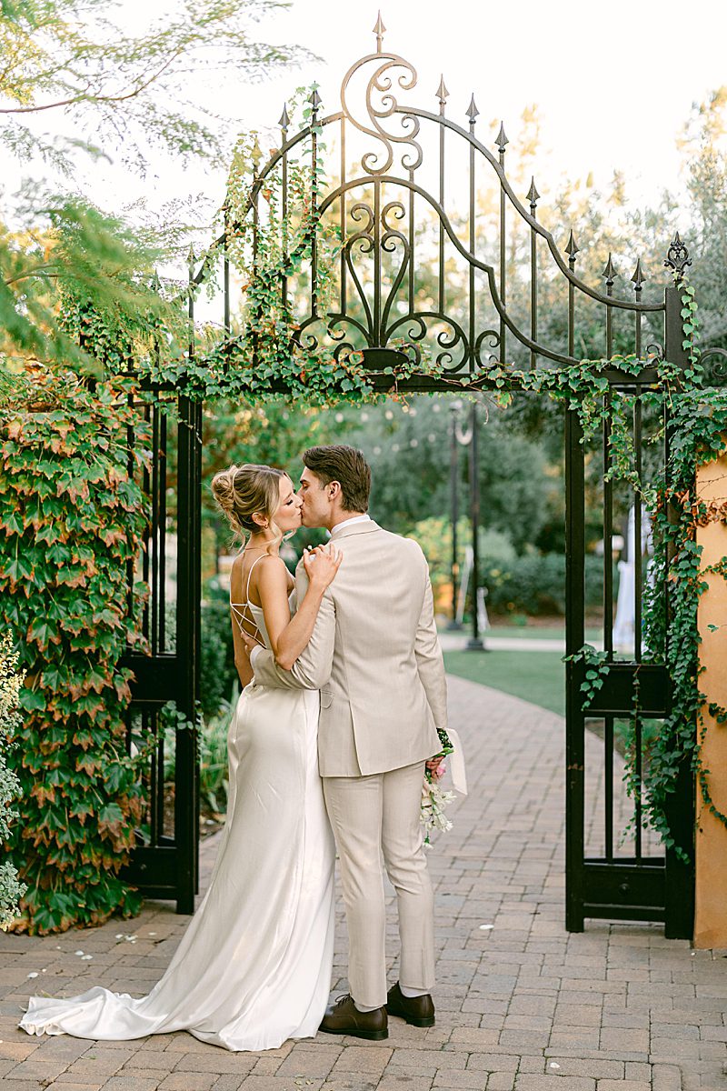 The Tuscan elegance at the Gardens at Los Robles Greens in Thousand Oaks, California was the perfect backdrop for this soft, romantic, floral-infused editorial designed by Samantha of To Be Loved Events. The tan suit from Friar Tux blended seamlessly with the organic color palette and the chic, slip dress from Ever After Bridal Boutique. The greenery and lush florals by Florally Ever After Design created a warm, inviting ambiance that paired perfectly with live music by Enchanted Strings. The iconic floral draped ceremony doors, flowing fountain, luxe champagne cart and custom dessert buffet by The Sweet Shoppe, and chic lounge from My Lovely Event Rentals were exciting and luxurious making the space feel incredibly special. And finally, to add to the charm, the unique stationery from Matinae Design Studio, beautiful white and gold tablescape with rentals from Otis & Pearl, and White Lola linen from Luxe Linen truly completed the vision. Danielle Bacon Photography captured the pin-worthy inspiration for a guest-centered celebration and European luxury in the heart of Southern California.